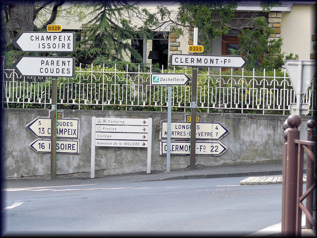 ![]() Panneaux directionnels et flèches Michelin sur la D225 à Vic-le-Comte (63) ». © jmlv | |||||||