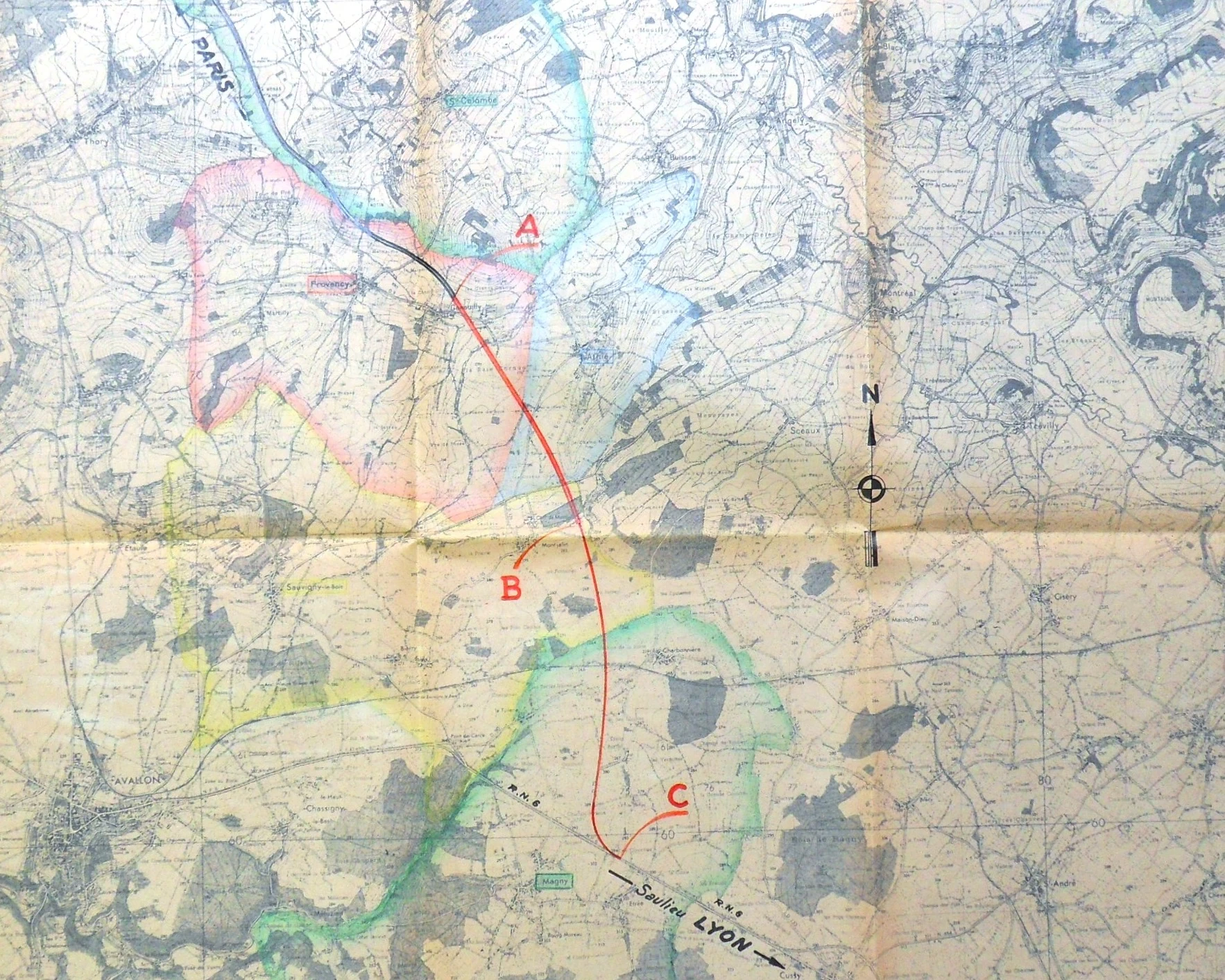 A la surprise de l’Ingénieur en Chef, ce projet de route départementale neuve débouchant à l’Est d’Avallon et qui aurait coûté moins cher au département qu’un simple renforcement du C.D. 86 est rejeté par le Conseil Général, la municipalité d’Avallon changeant d’avis au dernier moment et s’opposant à la proposition des Ponts-et-Chaussées pour exiger un contournement Nord de la ville et une arrivée par la R.N. 444. Sur conseil de la Direction des Routes qui considérait finalement qu’il serait possible de financer sans trop de difficultés la totalité des travaux sur le budget des Travaux Publics, l’Ingénieur en Chef remet à plus tard l’étude d’une voie nouvelle dédiée au raccordement d’Avallon et il prépare un nouvel avant-projet compatible avec les deux variantes de tracé envisagées dans la Côte d’Or. Le tracé préféré par le Service Spécial des Autoroutes, celui par l’Auxois, entre dans l’Yonne en suivant la voie ferrée Avallon-Les Laumes qui franchit le Serein en aval de Toutry. Pour le raccorder au tronçon Appoigny-La Cerce déclaré d’utilité publique, la meilleure solution consiste à rejoindre Provency en passant à l’Est du village de de Montjalin, sur la commune de Sauvigny-le-Bois, en évitant à la fois la dépression de Sceaux dans la Terre-Plaine, orientée vers le Nord-Est, et le vallon du ruisseau de l’Étang Tobie, affluent du Cousin, orienté vers le Sud-Ouest. Quant au tracé par la lisière orientale du Morvan, il pénètre dans l’Yonne au nord de Sainte-Magnance et longe la R.N. 6 jusqu’à la déviation de Cussy-les-Forges ; de là, pour obtenir la voie la plus courte et la moins accidentée, le plus simple est d’aller rejoindre le tracé par l’Auxois au niveau du hameau de Charbonnière et d’atteindre ainsi Provency. L’Ingénieur en Chef propose donc d’abandonner définitivement les emprises déclarées d’utilité publique à partir du Sud-Est de Provency, d’adopter un nouveau tracé pour l’autoroute de Provency jusqu’à l’Est du hameau de Charbonnière et de réaliser, à partir de Charbonnière, une voie de raccordement jusqu’à la déviation de Cussy-les-Forges suivant un tracé qui pourrait être intégré ultérieurement à l’autoroute dans le cas où la variante par le Morvan viendrait à être retenue dans le département de la Côte d’Or (voir plan n° 2). Ce nouveau tracé, présenté le 31 octobre 1956, n’est approuvé ni par le S.S.A., qui considère que la variante par l’Auxois a toutes les chances d’être retenue et que, dans ce cas, on devrait rechercher un raccordement à la R.N. 6 nettement moins long et surtout beaucoup moins cher, ni par les municipalités et les représentants agricoles des communes traversées qui trouvent qu’on sacrifierait trop de bonnes terres.