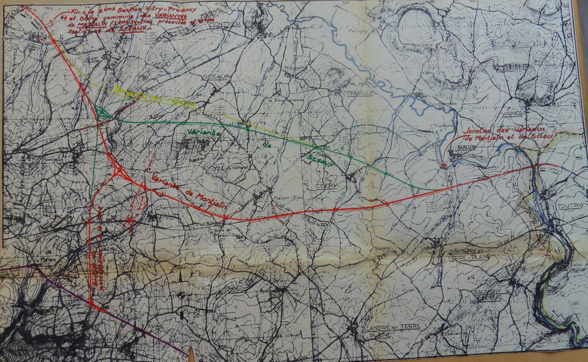 Au sein des Ponts-et-Chaussées, les différents experts consultés sur le sujet ne sont pas tous d’accord sur les risques techniques liés aux terrassements de grande hauteur sur le tracé de la variante de Sceaux. Le Service Spécial des Autoroutes conclut que le passage par la dépression de Sceaux est techniquement possible mais il reconnait qu’il y a un risque, même s’il paraît faible, que le coût de la construction soit beaucoup plus élevé qu’on ne l’estime et que le bilan économique de la variante de Sceaux devienne très négatif. En soulignant les lacunes du dossier technique, l’Inspecteur Général en charge de la circonscription suggère un compromis entre les partisans du tracé le plus court et ceux du tracé le moins pénalisant pour les communes traversées. C’est le tracé bleu sur le plan n° 8. Pour la petite histoire, l'Inspecteur Général en question n'était autre que Roger Renault, l'ancien Ingénieur en Chef de l'Yonne et "inventeur" de la route des plateaux 12 ans plus tôt, qui avait été promu 2 ans auparavant au Conseil Général des Ponts-et-Chaussées avec le titre d'Ingénieur Général. Dans une note de conclusion du 30 novembre 1963, le S.S.A. se rallie finalement à la solution de compromis de l’Inspecteur Général et le 6 décembre le ministre valide définitivement l’abandon de la variante de Sceaux. On revient donc à la variante de Montjalin dont on modifie les derniers kilomètres pour se raccorder au nouveau tracé dans la Côte d’Or. La bretelle vers la R.N. 6, dont la construction est pratiquement achevée, devra être doublée sur environ 1.500 mètres[11], jusqu’au Sud-Est de Montjalin où sera implanté l’échangeur.