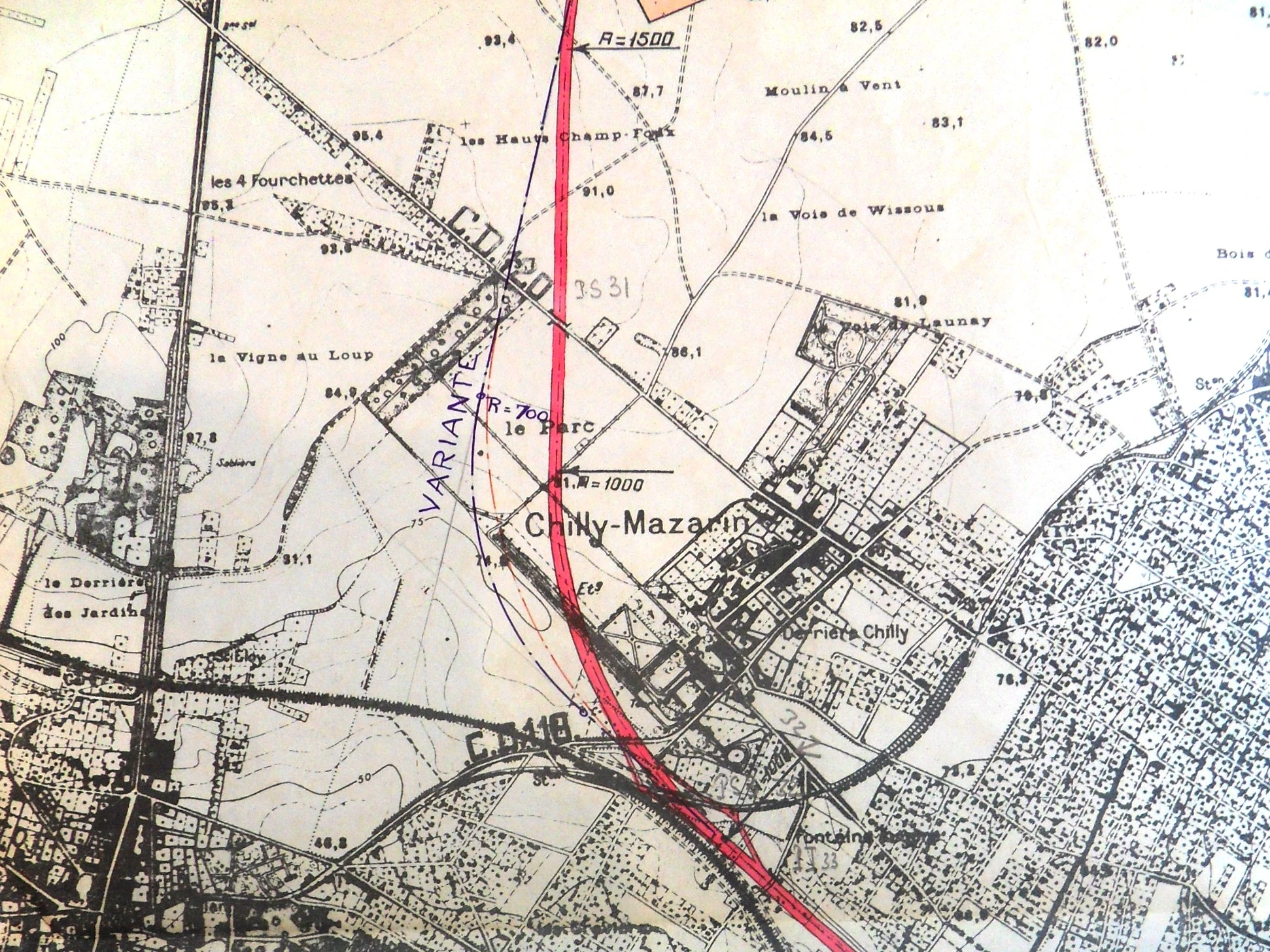 Sur la carte, noter l’échangeur qui est implanté au niveau d’une voie ferrée. Il s’agit de l’ancien tramway Paris-Arpajon, dit l’Arpajonnais, qui avait été abandonné en 1936 et dont la plateforme sera reprise par la déviation du C.D. 118 à l’occasion des travaux de l’autoroute.