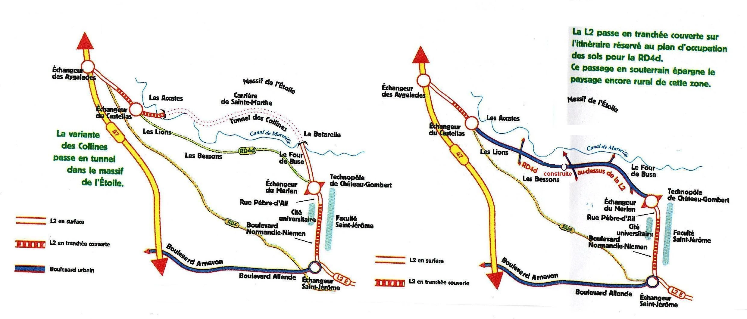 - L'autre traverserait la commune de Septèmes au lieu-dit "Les Caillols", monterait sur le flanc Sud-Ouest du Massif de l'Étoile (Plateau de la Mûre) et se raccorderait au réseau viaire primaire du côté du Merlan et de la ZUP N° 1.