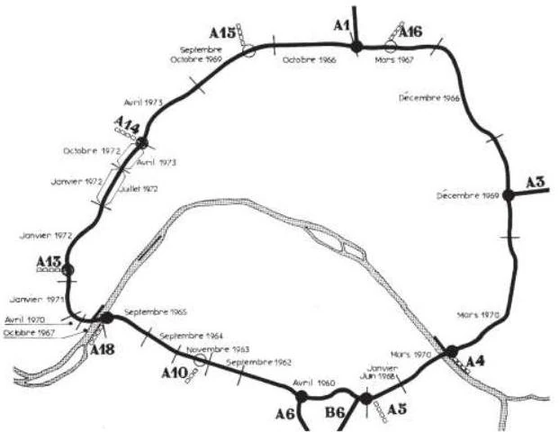 Historique des mises en service des différentes sections du Boulevard Périphérique de Paris. © Ville de Paris