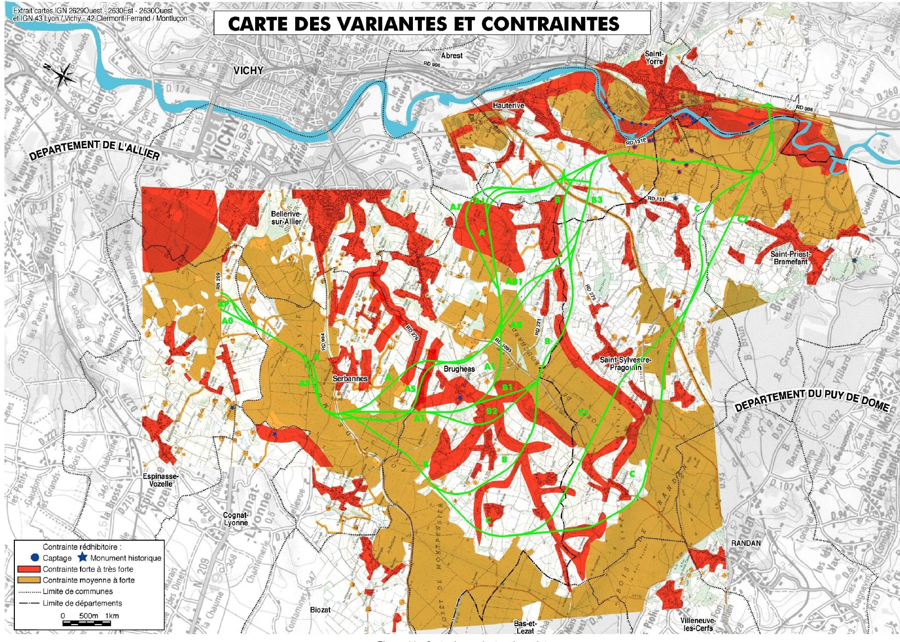 - La variante A offrait l’avantage d’un nombre de maisons à proximité du tracé plus réduit, et d’un franchissement de la vallée du Sarmon selon une topographie plus favorable, mais elle conduisait à isoler le domaine agricole de Murat et à la création d’une enclave agricole de 5 ha, au Nord de ce domaine, entre le contournement et la Forêt de Montpensier, impacts techniquement difficiles à compenser.