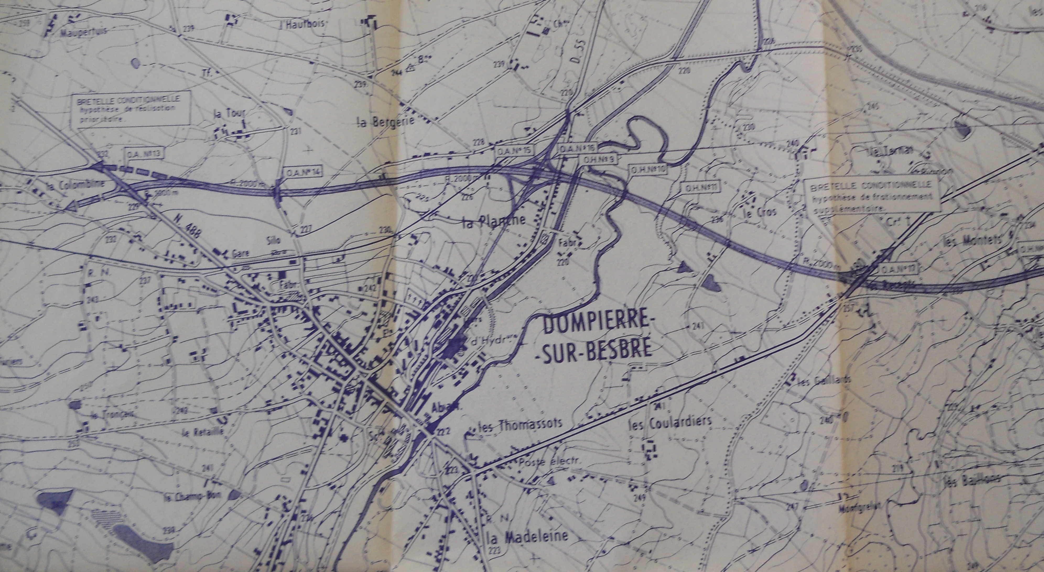 Pour la section suivante, le nombre de variantes étudiées fut bien plus important puisque ce ne sont pas moins de sept qui furent présentées pour la déviation de Dompierre-sur-Besbre en 1975. Un premier choix fut arrêté cette même année avec la variante Nord passant au plus proche de ville. Ce tracé reçut un avis mitigé, voire hostile d’une part de la population. Après plusieurs années rythmées par de nombreuses concertations avec les maires et la population, la DDE de l’Allier relança des études avec trois variantes au Nord de la ville s’écartant bien plus de l’agglomération que la variante retenue en 1975 et une variante contournant la ville par le Sud.