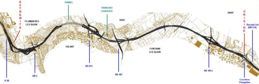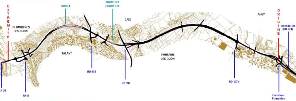 - Un passage par le centre-ville de Dijon, longeant le canal de l'Ouche et aboutissant au Boulevard des Gorgets. Un prolongement était même prévu à travers les zones urbanisées en direction de la rocade Est et de l'actuelle A39. Cette voie rapide urbaine inscrite au SDAU présentait des problèmes redoutables d'insertion en milieu urbain et elle a été rapidement abandonnée.