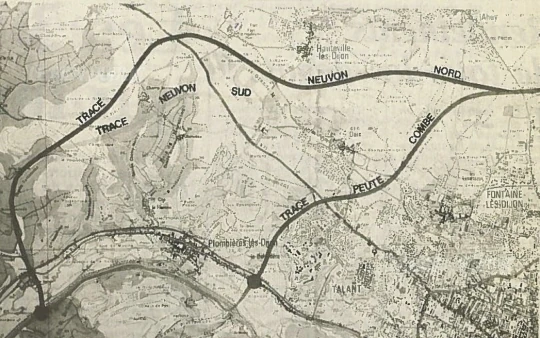 - Un passage plus à l'Ouest dénommé tracé de Neuvon, assez éloigné de l'agglomération et donc ne répondant pas aux besoins essentiels de desserte. Il est soutenu par la commune de Daix et les diverses associations d'opposants dont les habitations étaient susceptibles d'être affectées par le chantier, mais systématiquement recalé par les services de l'Etat.