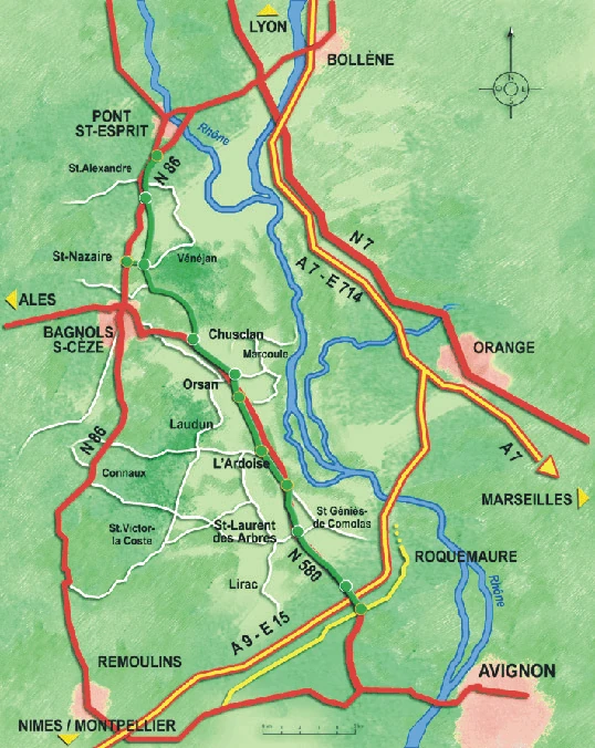 - Souvent présentée comme un axe neuf, la Rhodanienne possède en réalité un très long historique qui remonte à l'aménagement de la Vallée du Rhône. Entre Bagnols-sur-Cèze et Les Angles, la RN580 a été intégralement déviée sur une chaussée entre les années 1960 et 1980, à l'exception notable de la traversée de L'Ardoise. De fait, les travaux consistent à doubler la chaussée existante et à aménager certains carrefours, sauf au droit de Bagnols-sur-Cèze et L'Ardoise qui seront déviées par un nouveau tracé.