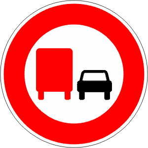 - La notion de dépassement interdit est traitée dans les articles R. 414-8, R.414-11, R 414-12 et R. 414-13 du Code de la Route. Ainsi le panneau B3a est utilisé en dehors des prescriptions générales du Code de la Route.