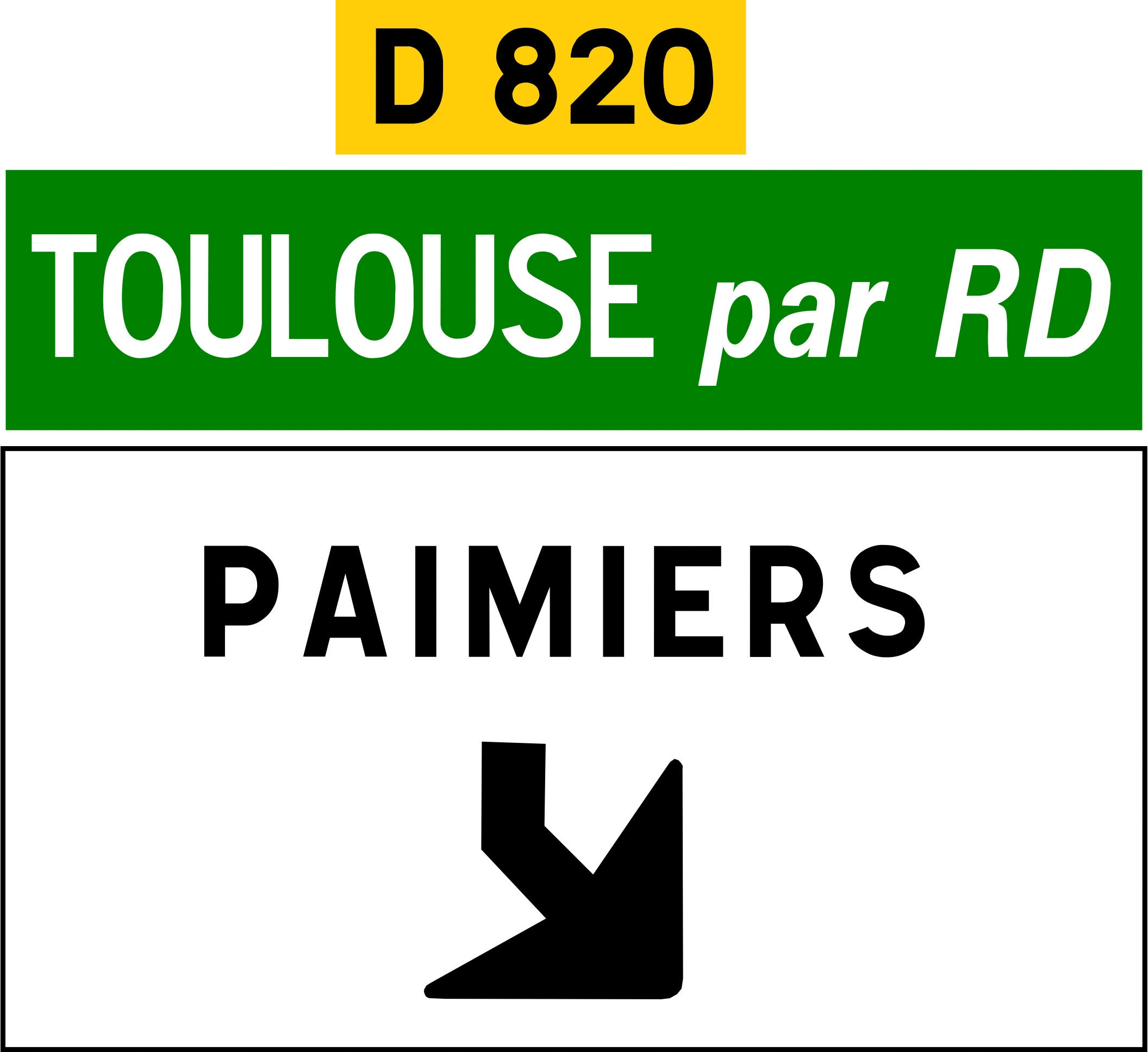 - Dans le cas d'une rocade, il peut comporter un registre mentionnant la dénomination de la sortie ou de la porte placé au dessus de celui comportant la flèche d'affectation de voie.
