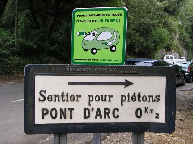 Vieux panneau d'accès au Pont d'Arc sur la D290 (07). © G.E.