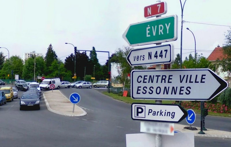 Cathédrale, Nombreux Monuments (vers D191) Panneau jalonnant la RN447 longtemps "oublié" à Corbeil-Essonnes (aujourd'hui déposé), vestige d'une époque où elle était l'un des maillons de la Francilienne.