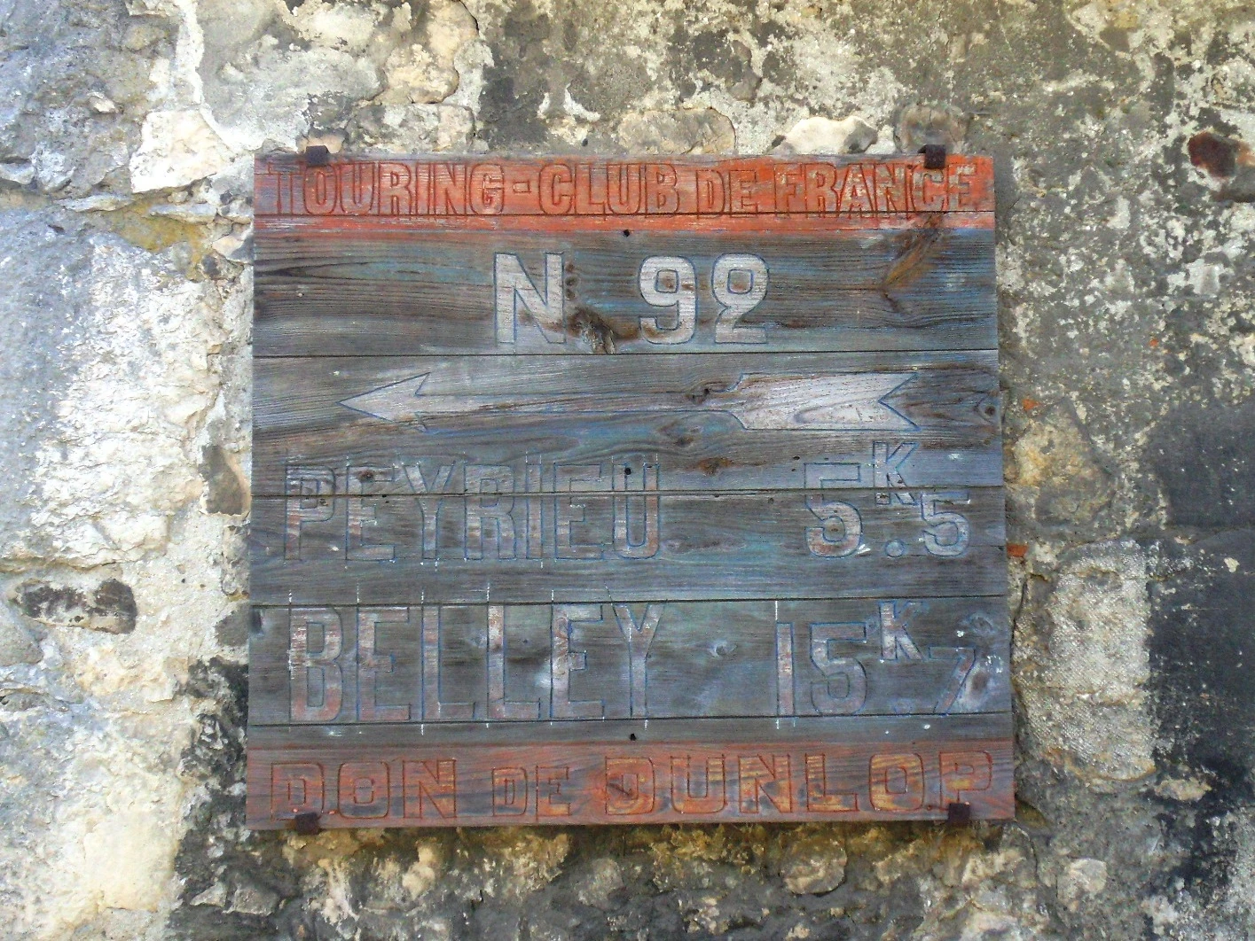 Ancien panneau Dunlop en bois à Murs-et-Gélignieux (01). © Dark_green67