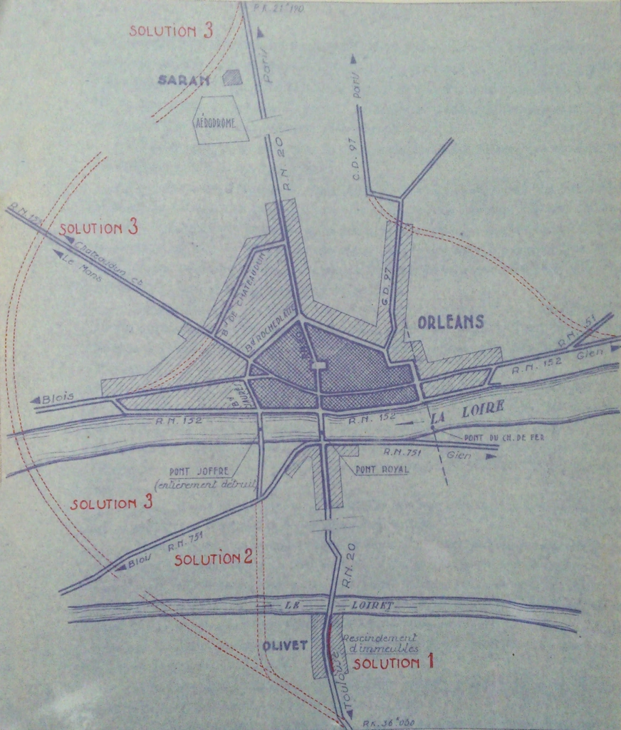 Dès 1940, la ville d'Orléans, en partie sinistrée, a établi un plan de reconstruction et d'extension qui prévoyait quelques améliorations locales en reprenant quelques parties de la solution 2 de 1936. Cependant, celle-ci avait perdu un atout majeur par rapport à la situation de 1936, car le pont Joffre avait été entièrement détruit en 1939.