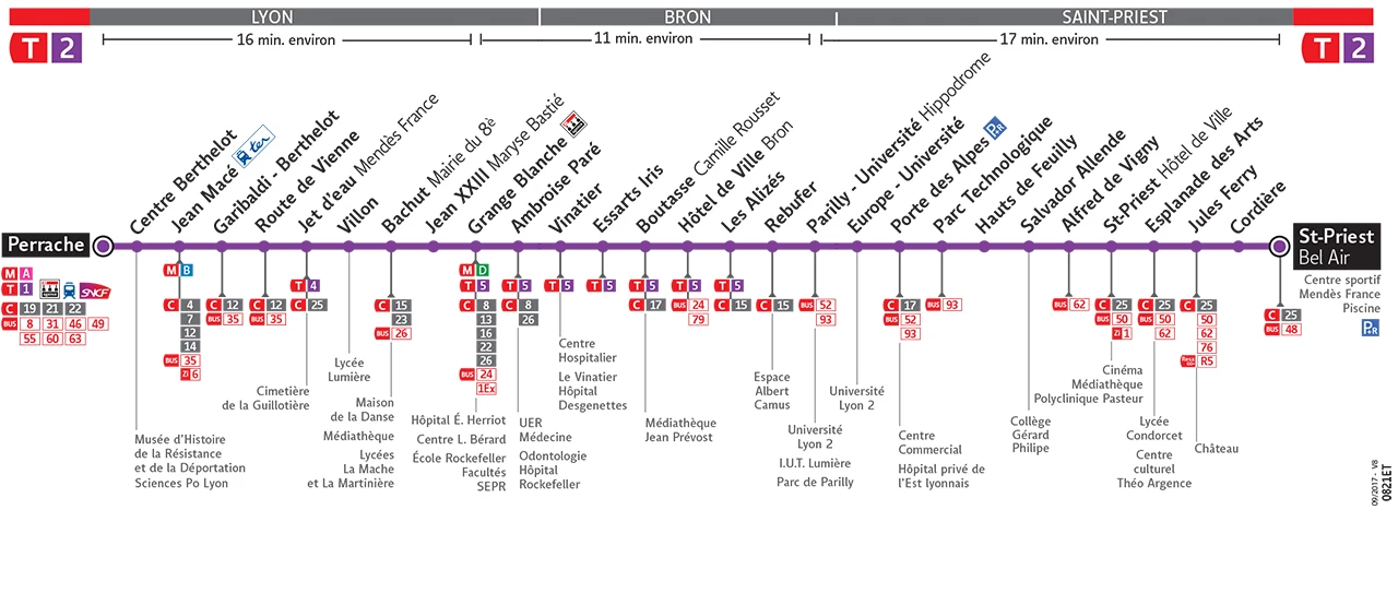 La ligne 2 du tramway de Lyon, abréviée T2 relie Hôtel de Région—Montrochet à Saint-Priest—Bel-Air.